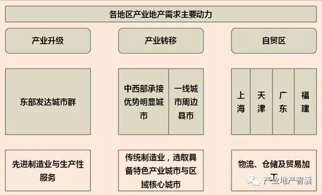 产业转移作为直接推力,不同地区在不同阶段将出现不同产业地产需求。我国东部沿海产业升级后将原有产业转移至中西部和大城市周边小城镇,激发不同类型产业地产需求;另外,自贸区、国家级新区、城镇化等也均为产业地产需求的动力。